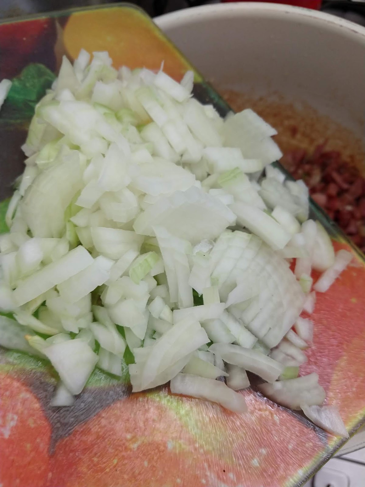 Quando o bacon estiver frito, adicione a linguiça calabresa picada.